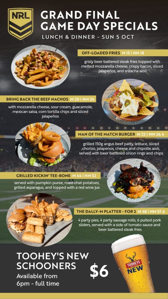 We’re kicking off the NRL Footy Finals ππ₯ with some awesome food specials in our Brasserie for lunch and Dinner on the Day.
